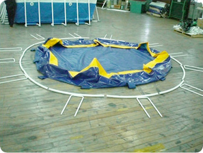 박스에서 수영장원단을 포장한백을 꺼내어 수영장을 설치하고자 하는 장소의 중아으로 옮긴 후 수영장원단을 펼친다. 이때 사다리 및 여과기의 위치를 확인한다. (수영장설치 장소에 날카로운 이물질을 제거하며, 수평 상태를 반드시 확인하여야한다.)